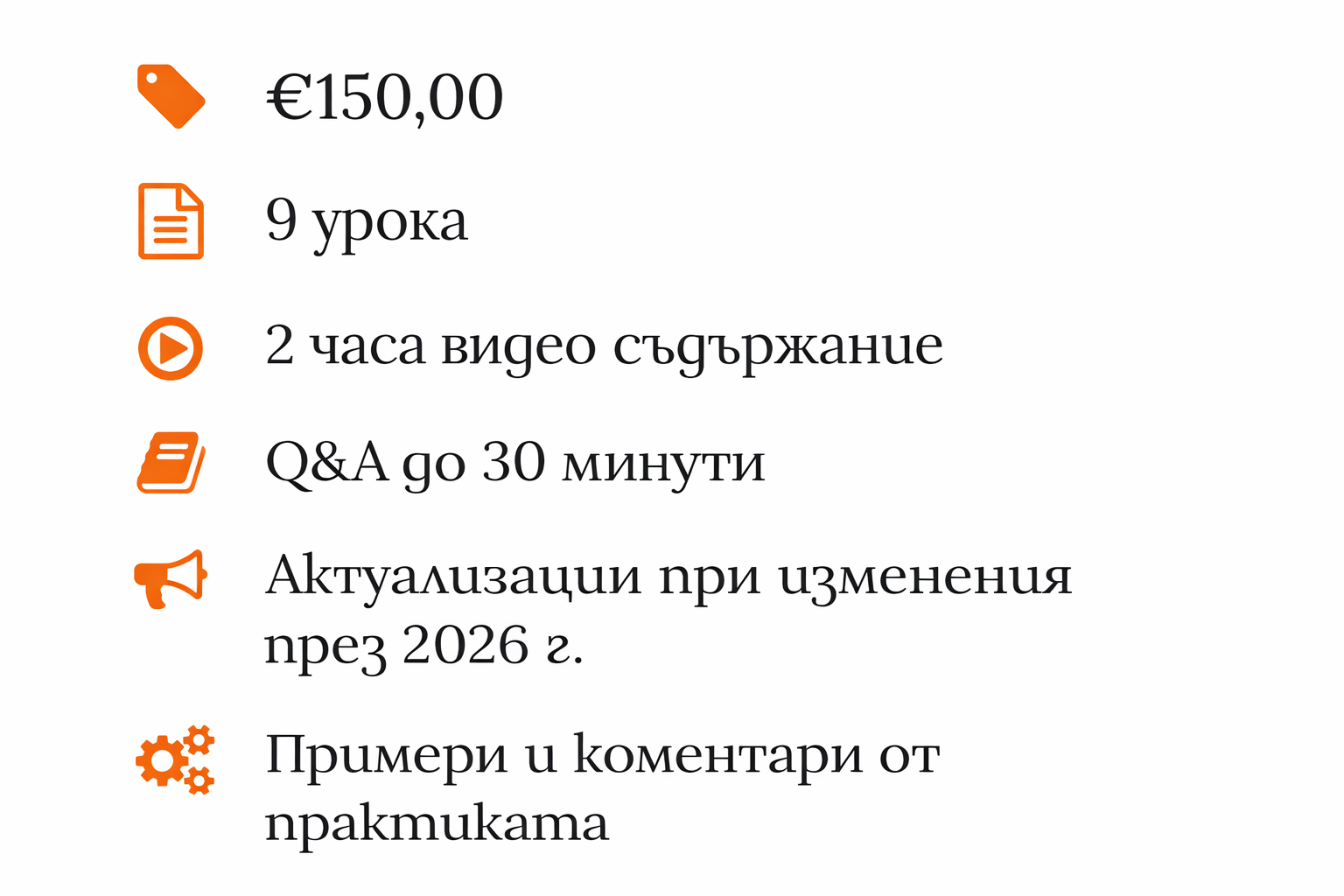 Да. Курсът включва Q&A сесия до 30 минути, както и актуализации при всички съществени промени в законодателството през 2026 г., така че информацията да остава винаги актуална и практична.